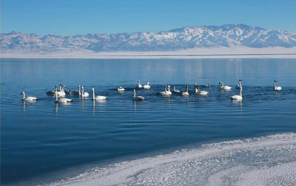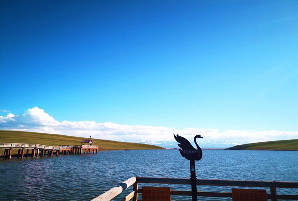 沿著木棧道漫步,看潔白的天鵝遊弋在澄澈湖面,與藍天、雪山、濕地相映成趣,宛如童話世界。
