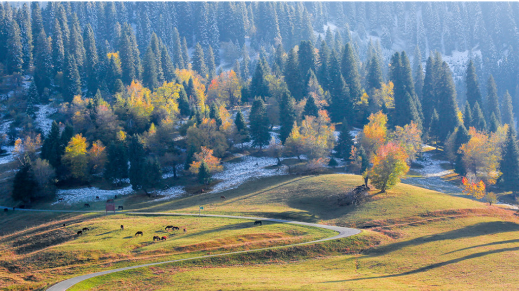 河谷草原則充滿人文氣息,塔吾薩尼一山四景,草原、森林、山丘、雪山同框。