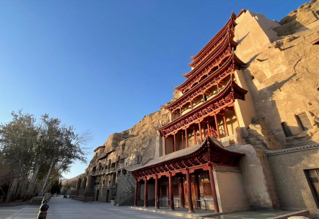 核心打卡點當屬窟區的標誌性景觀與經典洞窟。九層樓是莫高窟的「門面」,紅牆矗立在大漠藍天下,拍照極具辨識度。