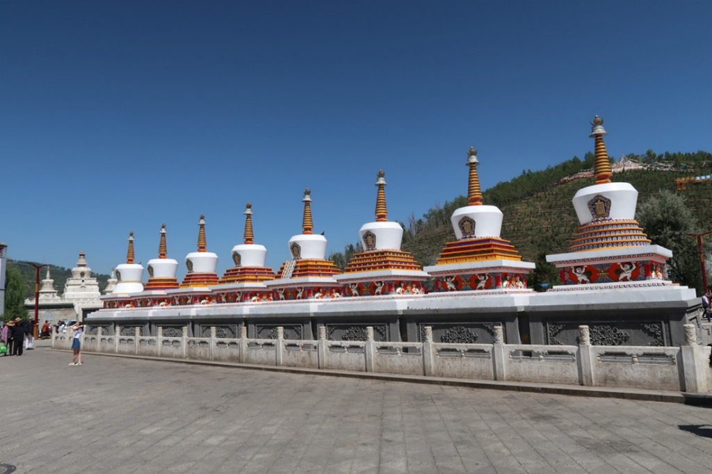 踏入山門,最先映入眼簾的便是八寶如意塔。八座潔白的佛塔沿中軸線整齊排列,分別象徵佛陀一生的八大功德,潔白塔身與藍天相映。