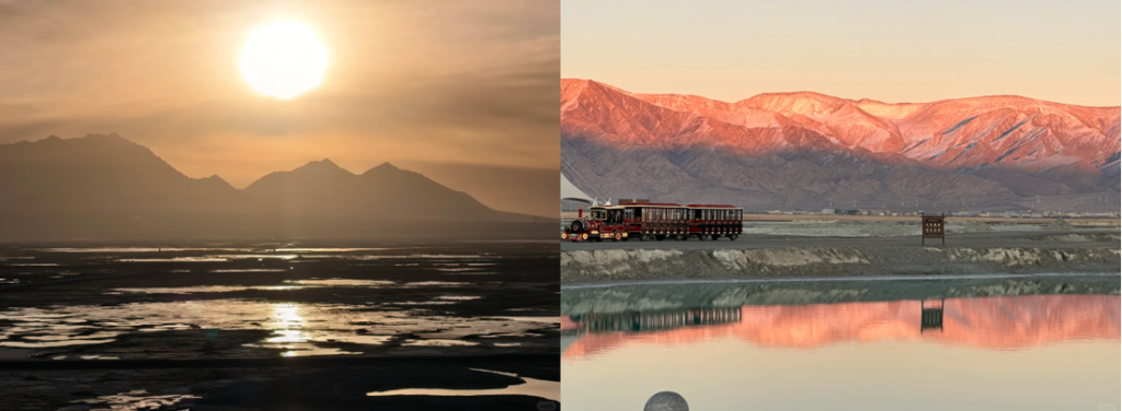 清晨,金色晨光灑向湖面,湖水折射出璀璨光澤,宛如碎鑽鋪就;傍晚,夕陽為鹽池鍍上暖橙色調,色彩層次愈發鮮明。