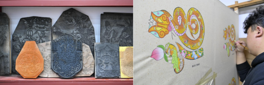 它以杜梨木為版,先刻出清晰線條,套印出基礎色塊,再由畫工手工填色、開臉,既有版畫的刀法韻味,又有繪畫的筆觸靈韻,「半印半繪」的特色讓每一幅作品都獨具匠心。