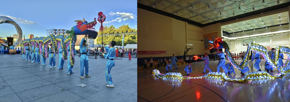 龍燈以藍、白為主色調,區別於常見的紅黃龍燈,盡顯出海蛟龍的雄渾氣象。