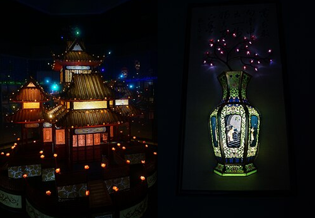 燈光穿透針孔,山水、花鳥、人物、亭台便纖毫畢現,光影流轉間如詩如畫,盡顯江南靈秀。