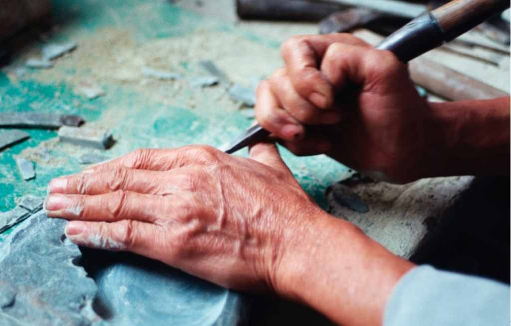 製作全程以手工為主,遵循採石、選料、制坯、設計、雕刻、打磨、配盒等多道工序,核心在於 「因材施藝、因石構圖」。